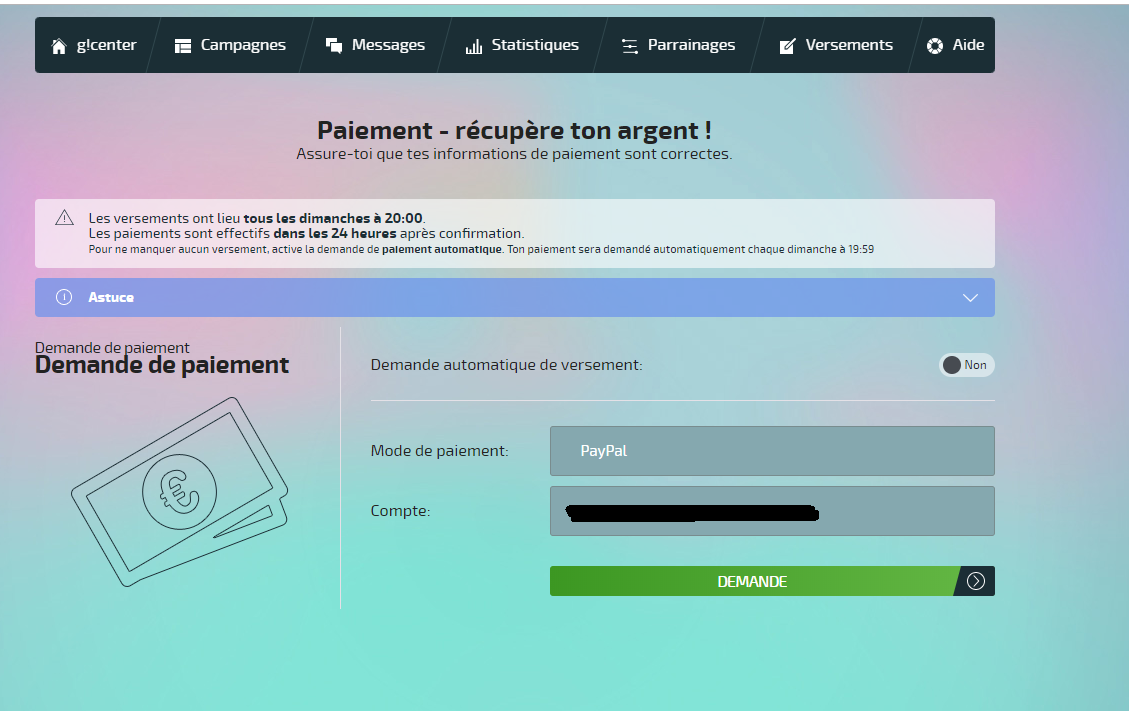 Enfin une fois que vous avez atteint 5€ vous pouvez demander une versement, ceux-ci sont effectués tous les dimanches à 20h00