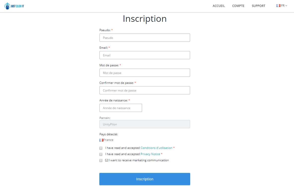 Puis réalisez l’inscription en remplissant le formulaire. Et cliquez sur « Soumettre ». Ensuite l’offre sera validée dans les 24h par l’admin de Just-Click It.