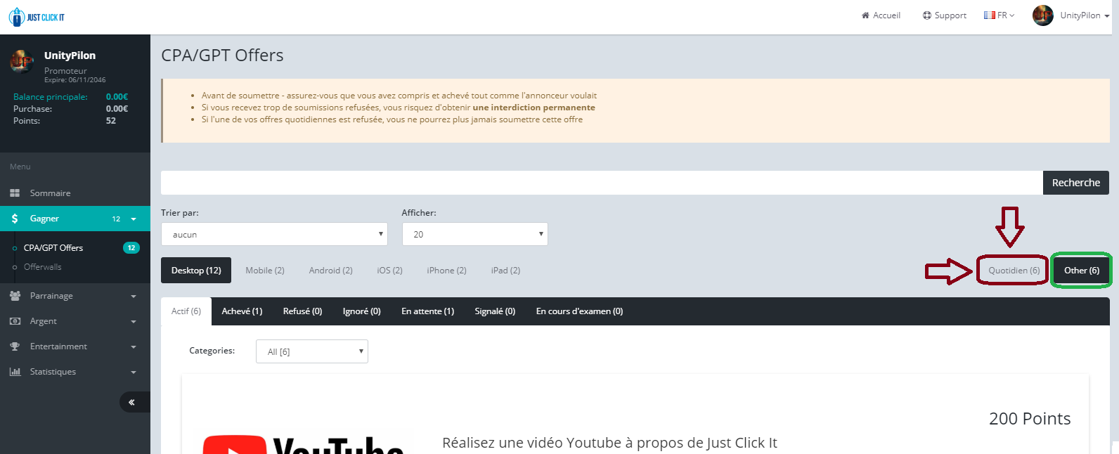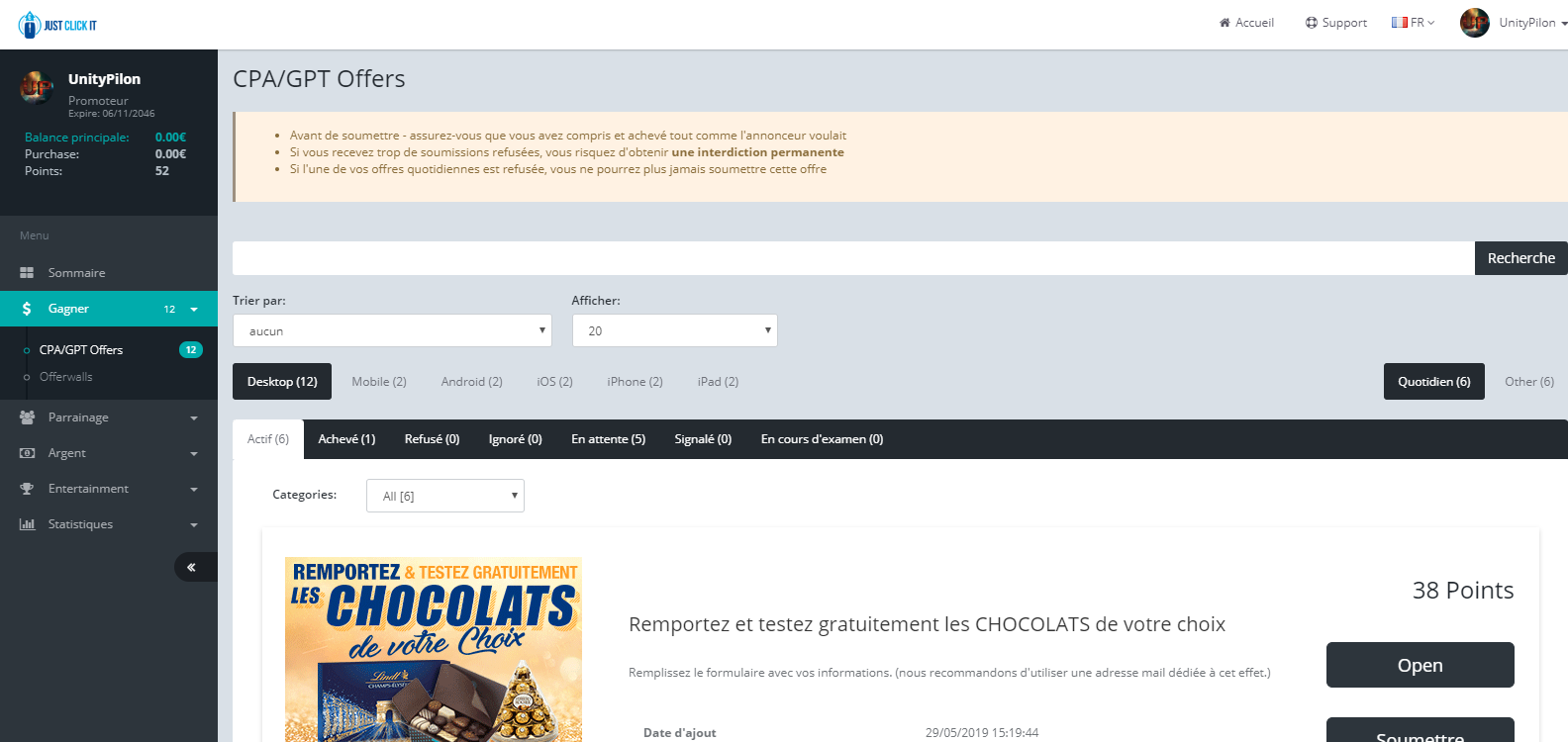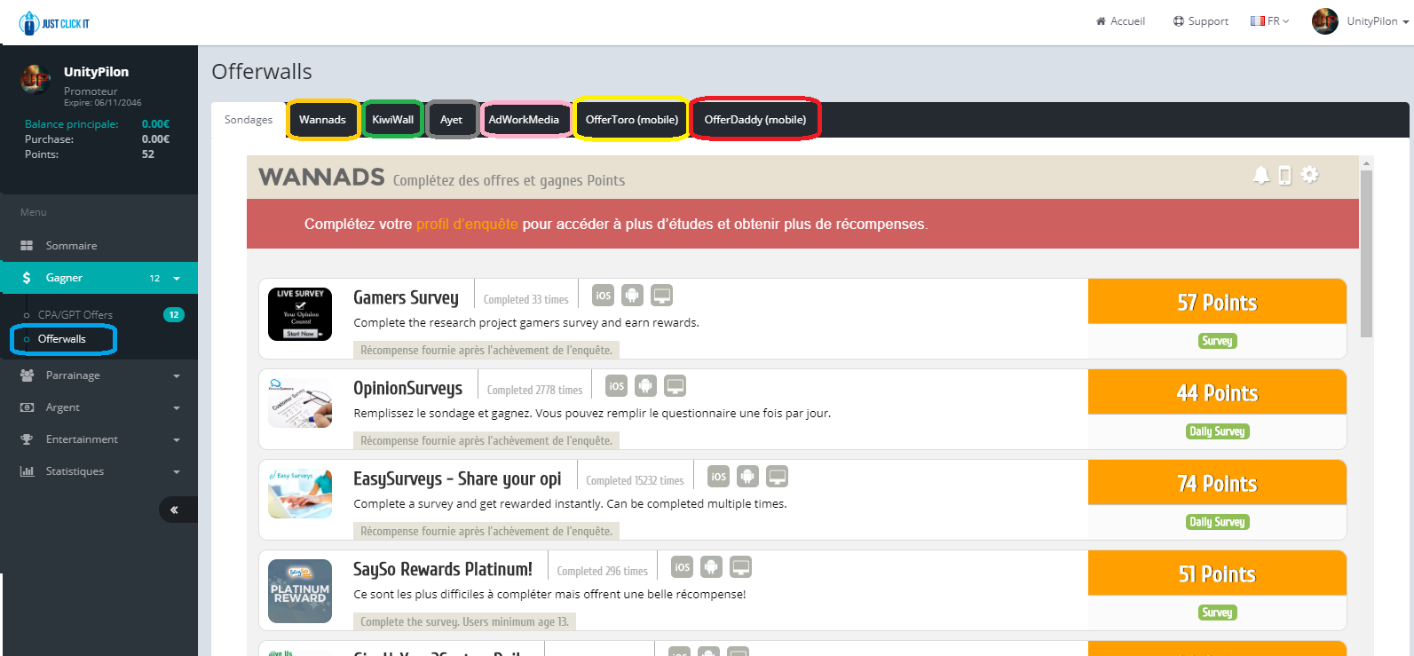 La seconde méthode pour gagner de l’argent sur le site sont les OfferWall