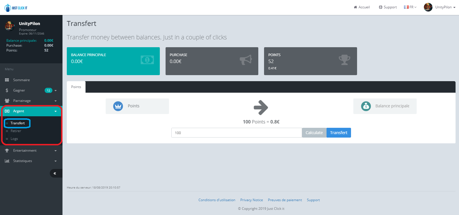Tout d’abord avant de pouvoir retirer vos gains il faudra que vous convertissiez vos points en euros, pour cela rendez vous dans la rubrique « Argent » puis « Transfert » (photo ci-dessous).