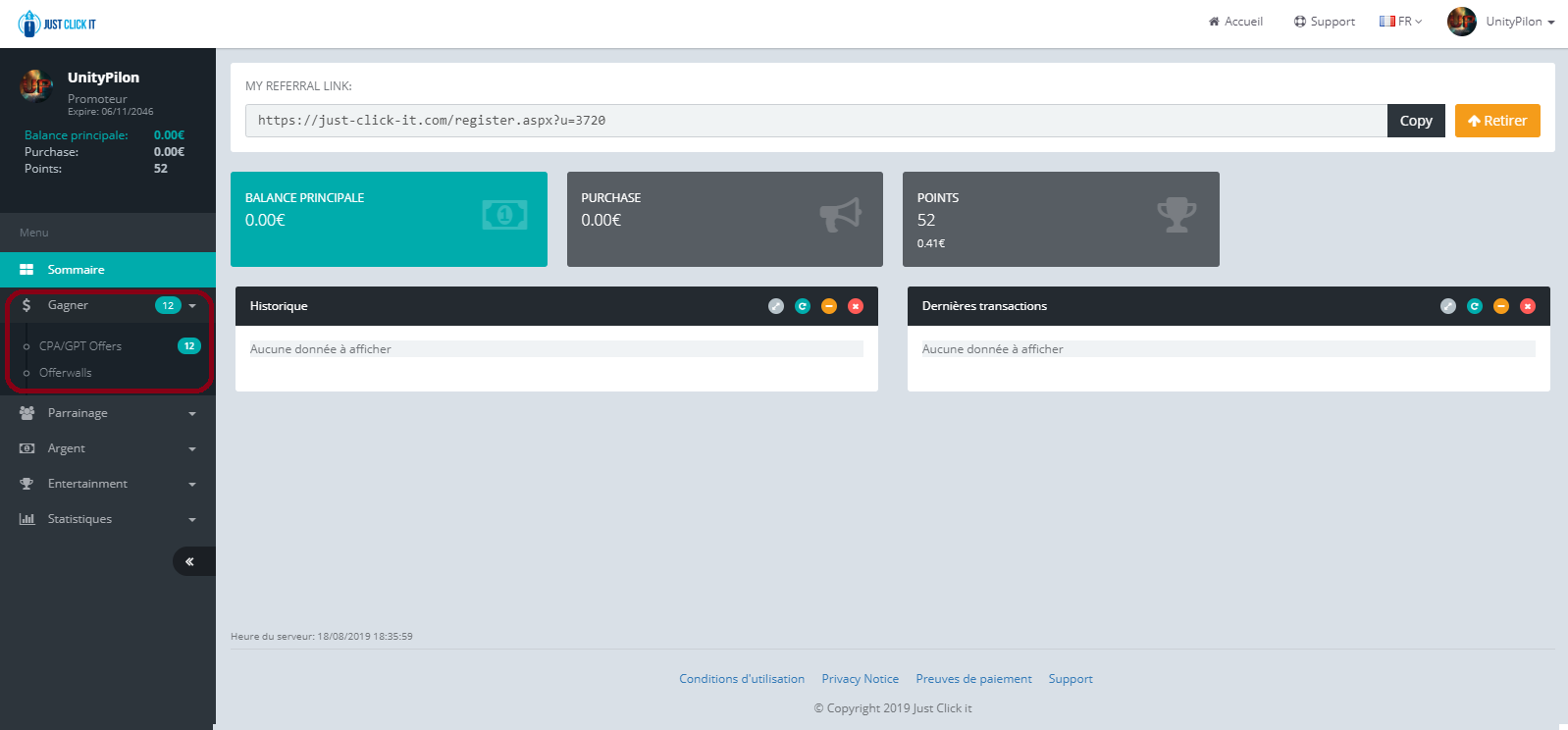 Tout d’abord, Just-Click It est site très récent qui a été créé le 30 Mai 2019. Il appartient aux GPT qui sont les sites multi-rémunérateur c’est à dire que le site vous propose différent moyens pour gagner de l’argent. Très souvent sur ces sites la méthode mise en avant est la réalisation d’inscriptions rémunératrices.