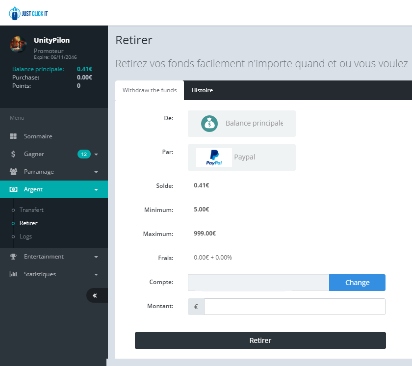 Enfin le seuil de payement sur Just-Click-It est de 5€. Pour le moment l’admin nous propose qu’un seul moyen de payement qui est Paypal mais de nouvelles méthodes de payement devraient voir le jour au fil du temps.